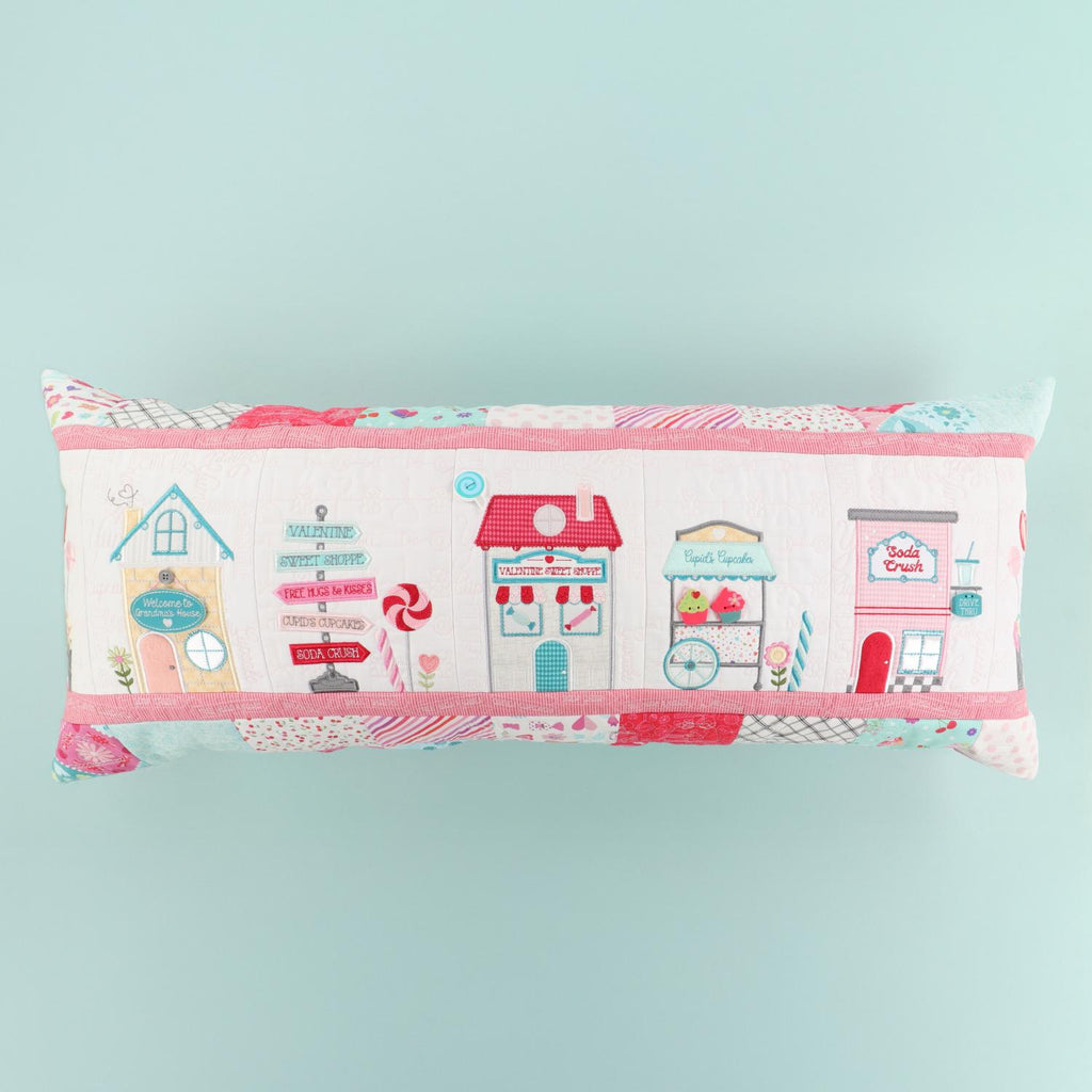 FABRIC KIT ONLY. This quilt kit features a charming design with a delightful street scene, showcasing whimsical shops and sweet treats, all framed by a border of patchwork patterns and candy-themed elements. Perfect for creating a cozy and playful bench pillow, this kit brings together vibrant colors and detailed illustrations that evoke a sense of nostalgia and joy, ideal for both personal use and as a unique gift.