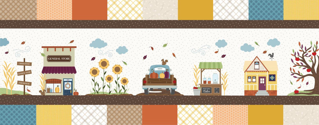 The fabric kit comes in a collectible box, and includes fabric for one Autumn Acres Bench Pillow top, sashing, and backing. 100% cotton.