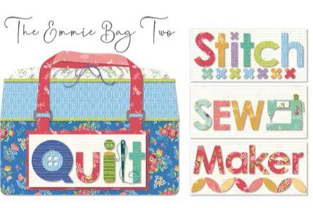Ever wish you had the right size bag to carry your quilt to the longarm quilter? Or perhaps a large enough bag to take UFO's on retreat? The new Emmie Bag Two is the perfect size with a cinched dust cover to keep your projects clean, storage pockets inside and out, plus a name tag and four designs to choose from for the front of the Emmie Bag. The designs are appliqued in-the-hoop with an embroidery machine (or appliqued manually) with this easy to follow all-color pattern that includes directions to make the bag plus a download code for the full size layout diagrams, reversed templates, the SVG cut files and in-the-hoop applique designs in the following formats: ART, DST, EXP, HUS, PCS, PES, SEW, JEF, SHV, VIP, VP3, XXX, with two hooping options: multi-hooped in a hoop with a minimum stitch field of at least 145mm x 255mm (5.7" x 10" BERNINA Oval hoop) or one hooping in a hoop with a minimum stitch field of 150mm x 400mm (BERNINA Mega hoop). Cover bag features Cherry's Awakening fabric for Riley Blake. The Emmie Bag Two finishes at 22" x 16" x 13"