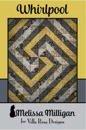 This stunning quilt, named Whirlpool, measures 54in x 66in and features a dynamic pattern of interlocking yellow, black, and grey fabric pieces, creating a mesmerizing swirl effect. Designed by Melissa Milligan for Villa Rosa Designs, this quilt not only adds a touch of elegance to any room but also showcases exceptional craftsmanship. The quilt's design is highlighted by intricate floral and geometric prints, providing both visual interest and a cozy feel. Perfect for both home decor and as a thoughtful gift.